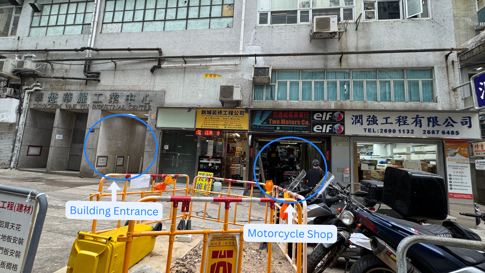 At the building’s main entrance, there is a motorcycle shop on the right. Enter the lobby, walk straight to the end, and take the passenger lift.